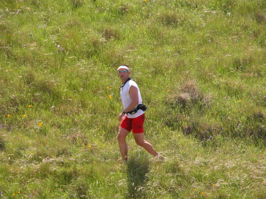 2004 Miwok 100k/SeeDaveRun10.jpgPrevious | Home | NextThe grass and flowers look cool here, purple and yellow flowers everywhere on this ridge. The trail was good sometimes, but very narrow, much of it very slanted with a few washed out spots. Looks like it'd be so nice to run here, but I didn't care for it. It was nice that you could see runners in front that you could work on catching though. |